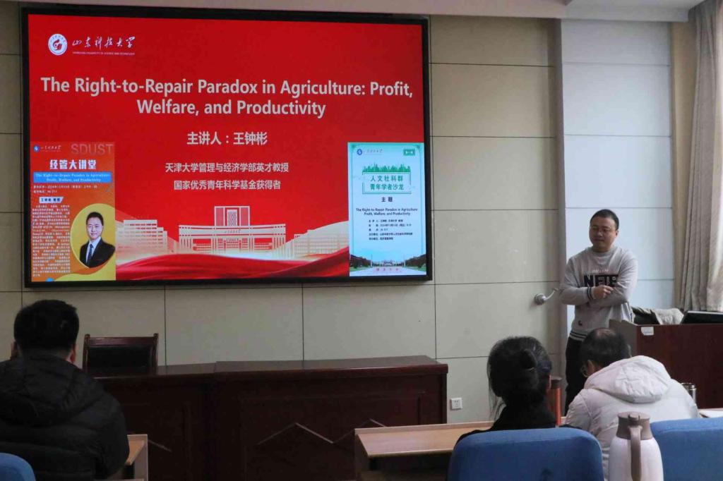 12 月 13 日,经管学院于学院楼三楼会议室举办经管大讲堂与人文社科群青年学者沙龙活动,特邀天津大学管理与经济学部王钟彬教授担任主讲嘉宾,围绕“农业中的“修理权”悖论:利润、福利与生产力”为学院师生作学术报告,吸引了学院多名青年教师以及博士、硕士研究生积极参与。