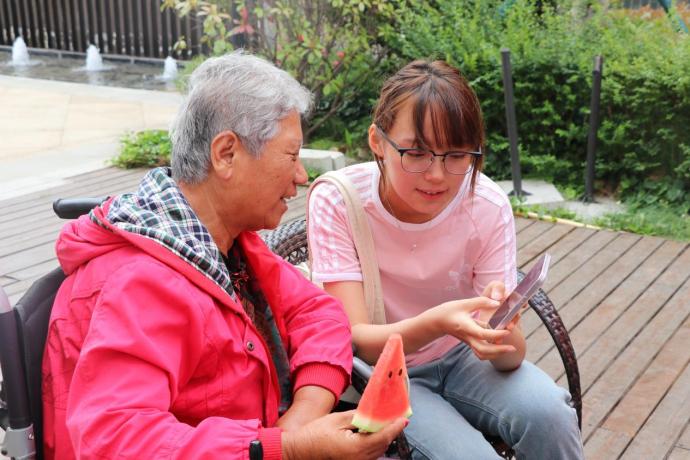 仪式结束后,学院志愿者们在护养院分组开展志愿服务活动,有的与老人们聊天,倾听他们的心声;有的为老人们唱歌、讲笑话,让老人们感受到欢乐与温暖。志愿者们的到来,让护养院变得热闹起来,老人们的脸上都洋溢着幸福开心的笑容。